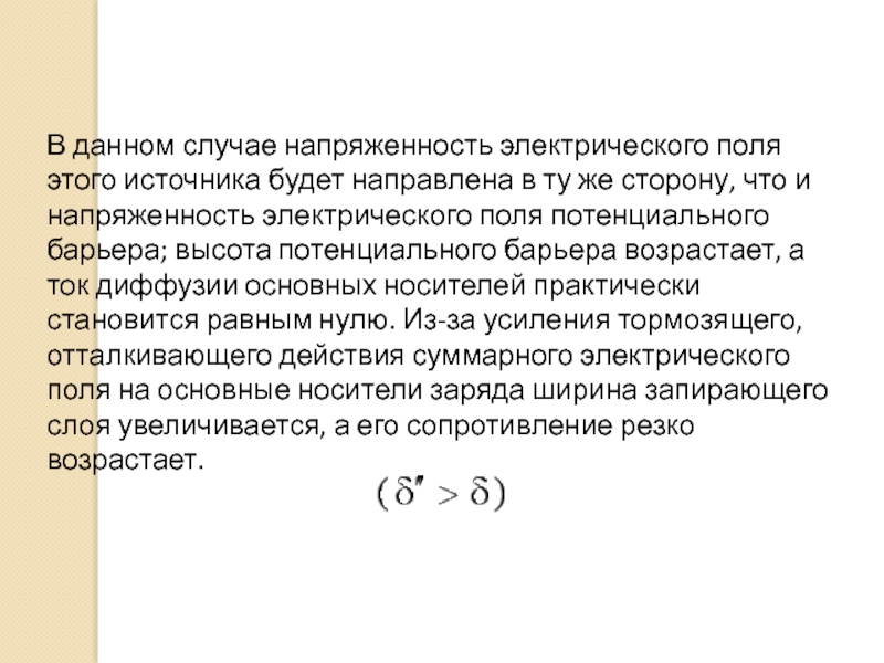 барьера; высота потенциального барьера возрастает, а ток диффузии основных носителей практически становится равным нулю. Из-за усиления тормозящего, отталкивающего действия суммарного электрического поля на основные носители заряда ширина запирающего слоя увеличивается, а его сопротивление резко возрастает.