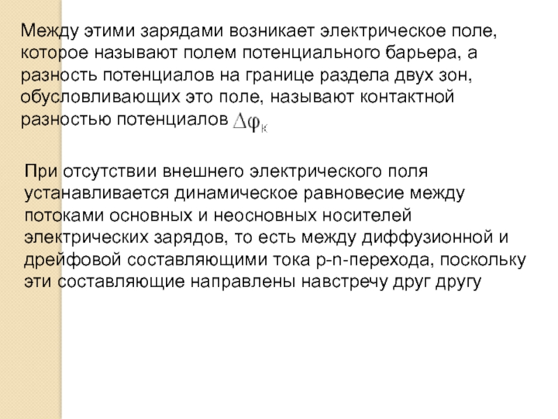 При отсутствии внешнего электрического поля устанавливается динамическое равновесие между потоками основных и неосновных носителей электрических зарядов, то есть между диффузионной и дрейфовой составляющими тока p-n-перехода, поскольку эти составляющие направлены навстречу друг другу