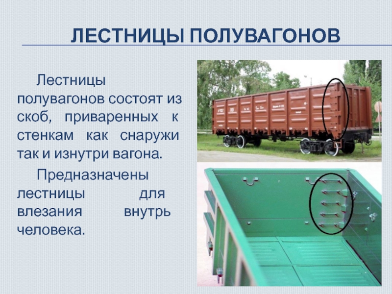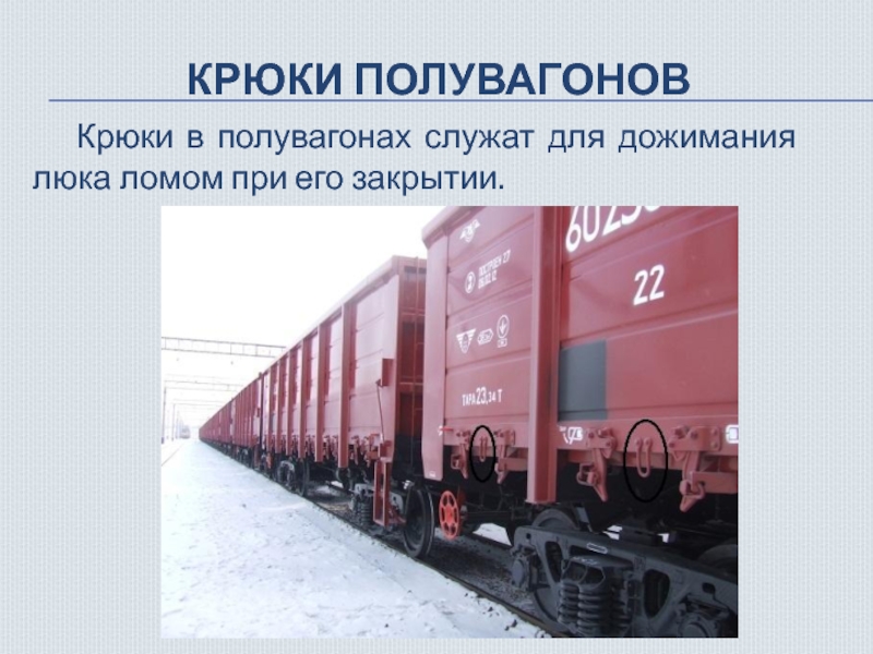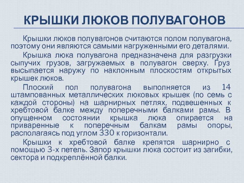 Плоский пол полувагона выполняется из 14 штампованных металлических люковых крышек (по семь с каждой стороны) на шарнирных петлях, подвешенных к хребтовой балке между поперечными балками рамы. В опущенном состоянии крышка люка опирается на приваренные к поперечным балкам рамы опоры, располагаясь под углом 330 к горизонтали.