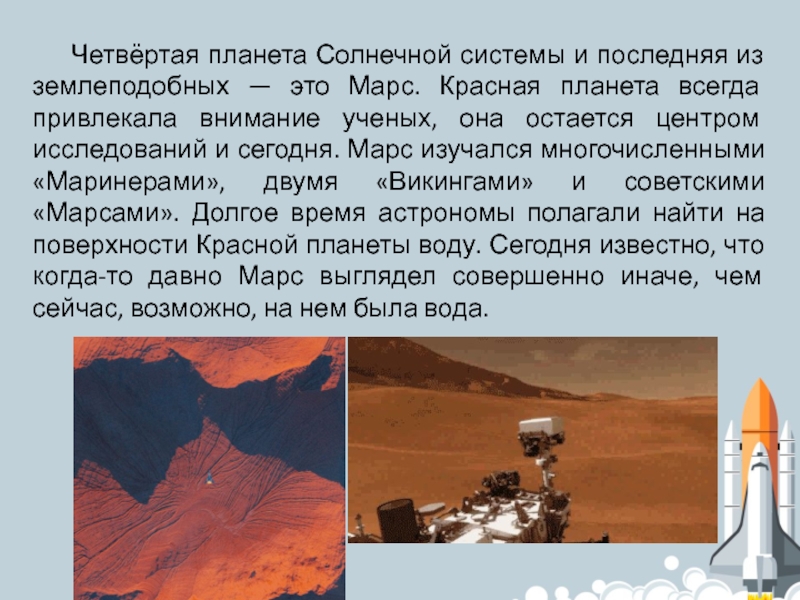 она остается центром исследований и сегодня. Марс изучался многочисленными «Маринерами», двумя «Викингами» и советскими «Марсами». Долгое время астрономы полагали найти на поверхности Красной планеты воду. Сегодня известно, что когда-то давно Марс выглядел совершенно иначе, чем сейчас, возможно, на нем была вода.