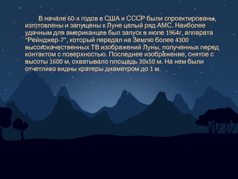 к Луне целый ряд АМС. Наиболее удачным для американцев был запуск в июле 1964г. аппарата “Рейнджер-7”, который передал на Землю более 4300 высококачественных ТВ изображений Луны, полученных перед контактом с поверхностью. Последнее изображение, снятое с высоты 1600 м, охватывало площадь 30x50 м. На нем были отчетливо видны кратеры диаметром до 1 м.