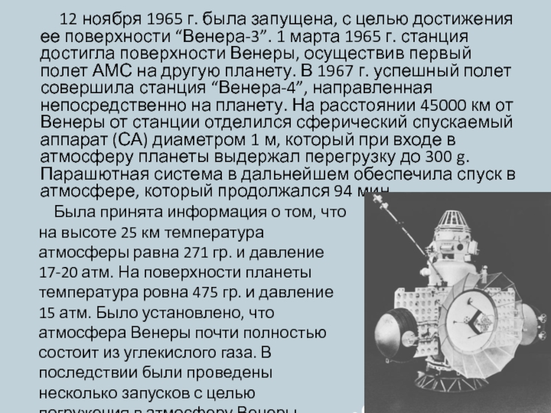 станция достигла поверхности Венеры, осуществив первый полет АМС на другую планету. В 1967 г. успешный полет совершила станция “Венера-4”, направленная непосредственно на планету. На расстоянии 45000 км от Венеры от станции отделился сферический спускаемый аппарат (СА) диаметром 1 м, который при входе в атмосферу планеты выдержал перегрузку до 300 g. Парашютная система в дальнейшем обеспечила спуск в атмосфере, который продолжался 94 мин.