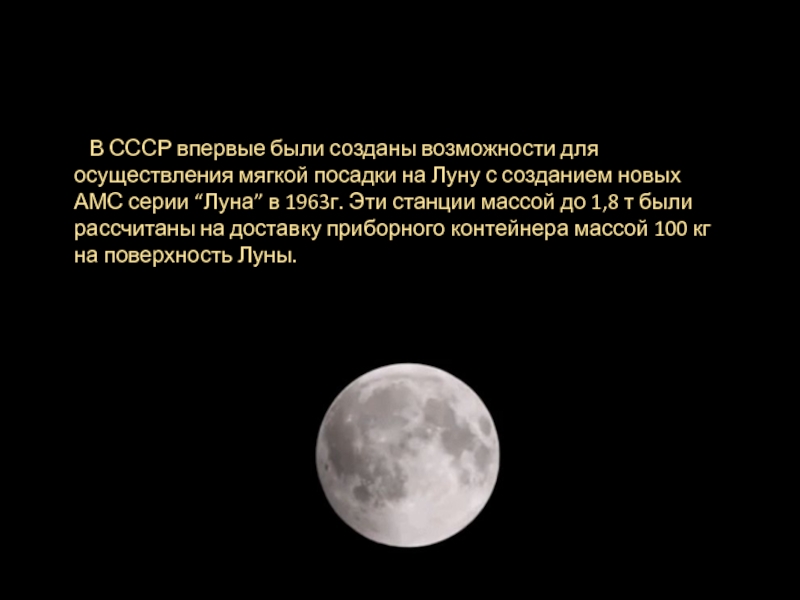 в 1963г. Эти станции массой до 1,8 т были рассчитаны на доставку приборного контейнера массой 100 кг на поверхность Луны.