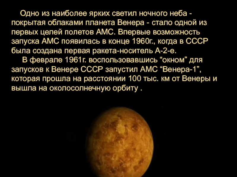 В феврале 1961г. воспользовавшись “окном” для запусков к Венере СССР запустил АМС “Венера-1”, которая прошла на расстоянии 100 тыс. км от Венеры и вышла на околосолнечную орбиту .