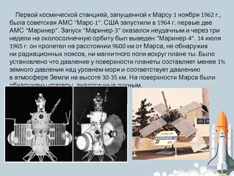 АМС “Маринер”. Запуск “Маринер-3” оказался неудачным и через три недели на околосолнечную орбиту был выведен “Маринер-4”. 14 июля 1965 г. он пролетел на расстоянии 9600 км от Марса, не обнаружив ни радиационных поясов, ни магнитного поля вокруг плане ты. Было установлено что давление у поверхности планеты составляет менее 1% земного давления над уровнем моря и соответствует давлению в атмосфере Земли на высоте 30-35 км. На поверхности Марса были обнаружены кратеры, аналогичные лунным.