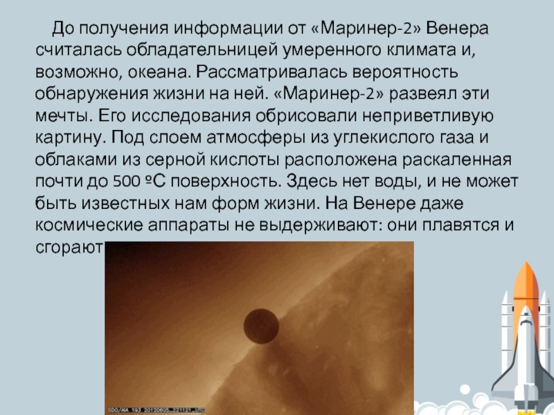 Слайд 14 До получения информации от «Маринер-2» Венера считалась обладательницей