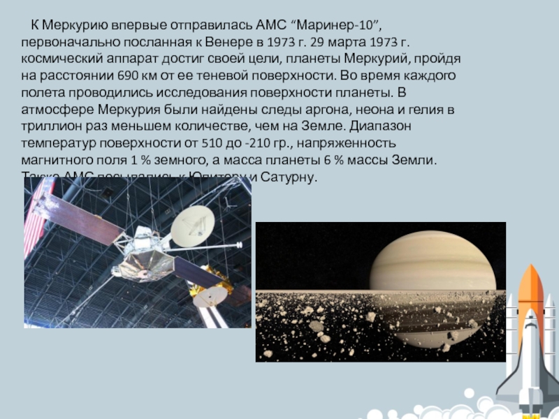 Слайд 11 К Меркурию впервые отправилась АМС “Маринер-10”, первоначально посланная