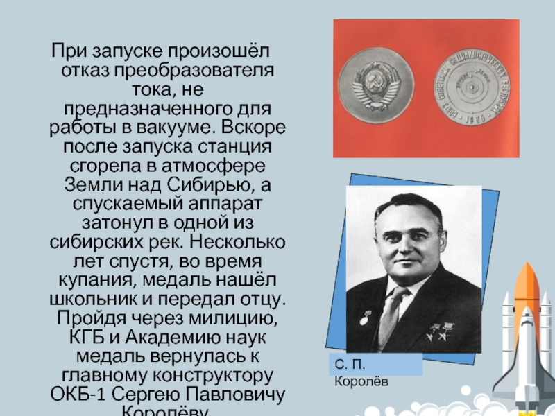 над Сибирью, а спускаемый аппарат затонул в одной из сибирских рек. Несколько лет спустя, во время купания, медаль нашёл школьник и передал отцу. Пройдя через милицию, КГБ и Академию наук медаль вернулась к главному конструктору ОКБ-1 Сергею Павловичу Королёву.