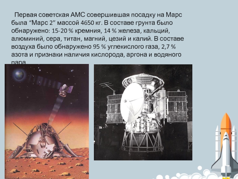 Слайд 10 Первая советская АМС совершившая посадку на Марс была “Марс