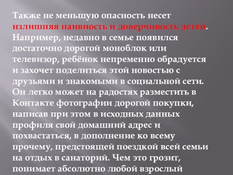 захочет поделиться этой новостью с друзьями и знакомыми в социальной сети. Он легко может на радостях разместить в Контакте фотографии дорогой покупки, написав при этом в исходных данных профиля свой домашний адрес и похвастаться, в дополнение ко всему прочему, предстоящей поездкой всей семьи на отдых в санаторий. Чем это грозит, понимает абсолютно любой взрослый человек, но далеко не каждый ребёнок.