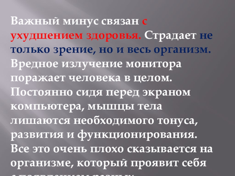 Слайд 12Важный минус связан с ухудшением здоровья. Страдает не только зрение,