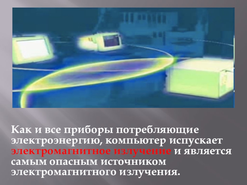 Слайд 13Как и все приборы потребляющие электроэнергию, компьютер испускает электромагнитное излучение