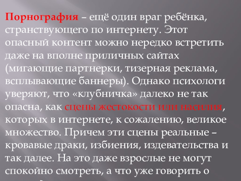 партнерки, тизерная реклама, всплывающие баннеры). Однако психологи уверяют, что «клубничка» далеко не так опасна, как сцены жестокости или насилия, которых в интернете, к сожалению, великое множество. Причем эти сцены реальные – кровавые драки, избиения, издевательства и так далее. На это даже взрослые не могут спокойно смотреть, а что уже говорить о детской психике….