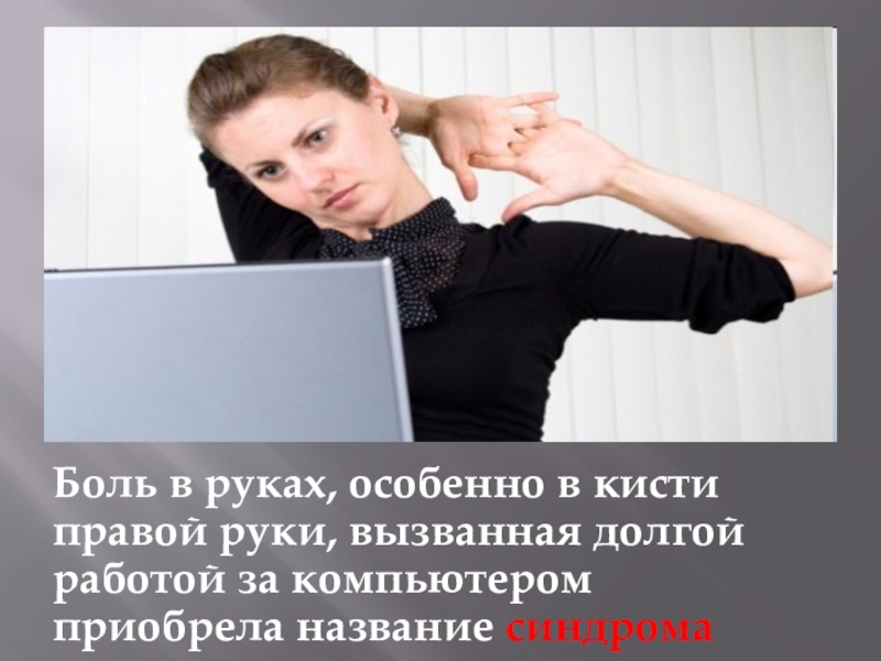 Слайд 16Боль в руках, особенно в кисти правой руки, вызванная долгой