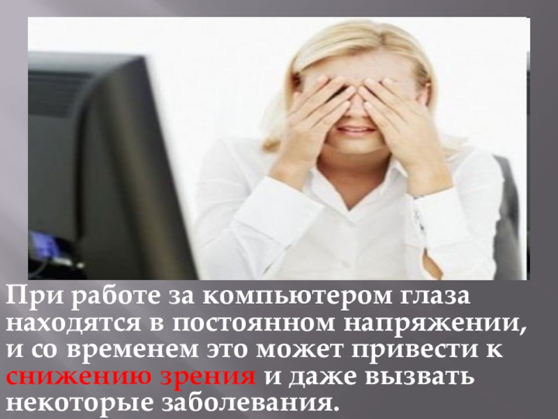 Слайд 14При работе за компьютером глаза находятся в постоянном напряжении, и