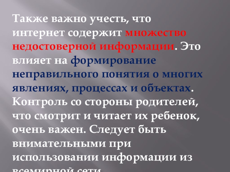 Слайд 18Также важно учесть, что интернет содержит множество недостоверной информации. Это влияет