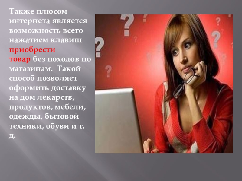 Слайд 24Также плюсом интернета является возможность всего нажатием клавиш приобрести товар без