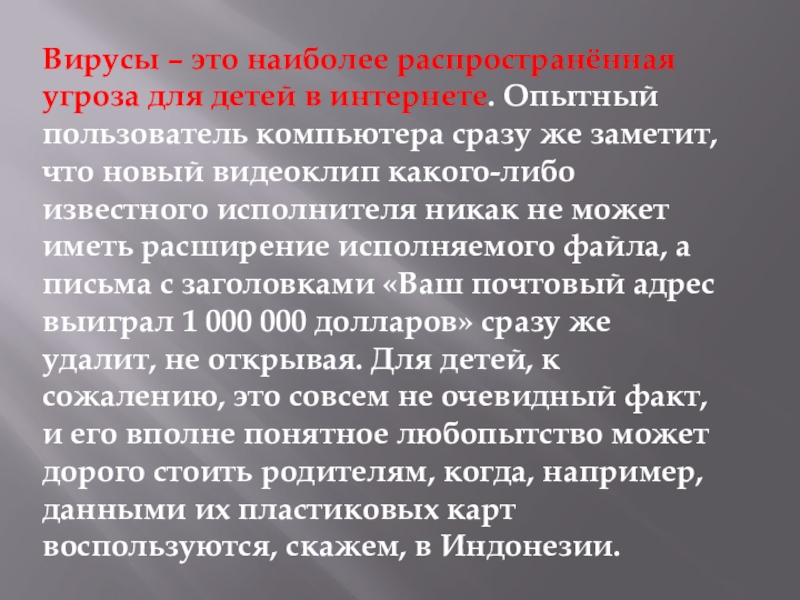 Слайд 4Вирусы – это наиболее распространённая угроза для детей в интернете. Опытный