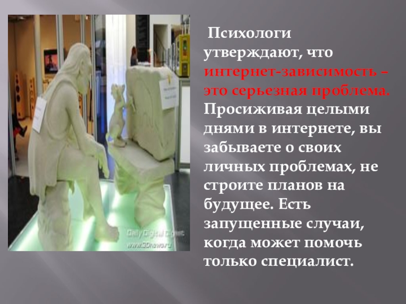 Слайд 20 Психологи утверждают, что интернет-зависимость – это серьезная проблема. Просиживая целыми