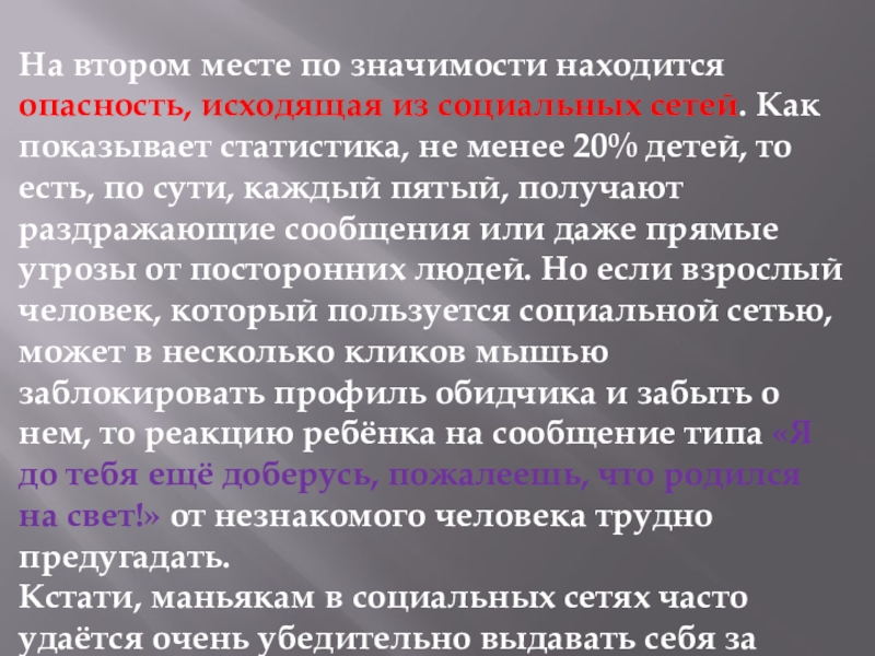 Кстати, маньякам в социальных сетях часто удаётся очень убедительно выдавать себя за парня из соседнего класса в школе, который желает познакомиться.