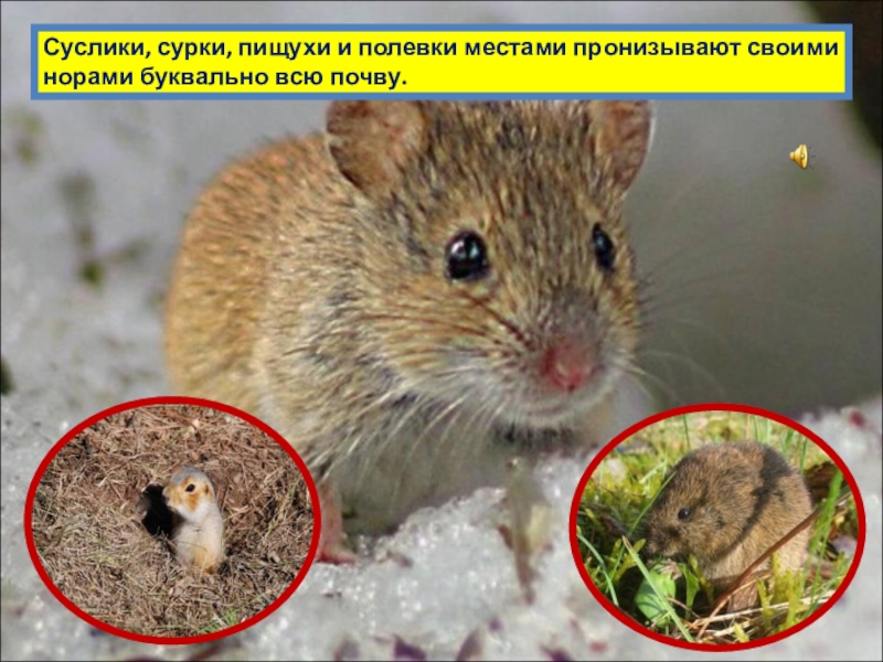 Слайд 11Суслики, сурки, пищухи и полевки местами пронизывают своими норами буквально