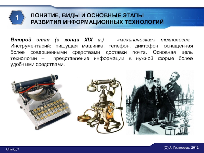 Первый этап (до второй половины XIX в.) – «ручная» информационная технология. Инструментарий: перо, чернильница, книга. Основная цель технологии – представление информации в нужной форме.