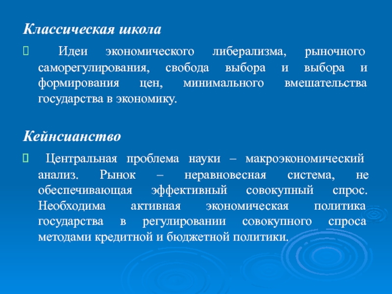Центральная проблема науки – макроэкономический анализ. Рынок – неравновесная система, не обеспечивающая эффективный совокупный спрос. Необходима активная экономическая политика государства в регулировании совокупного спроса методами кредитной и бюджетной политики.