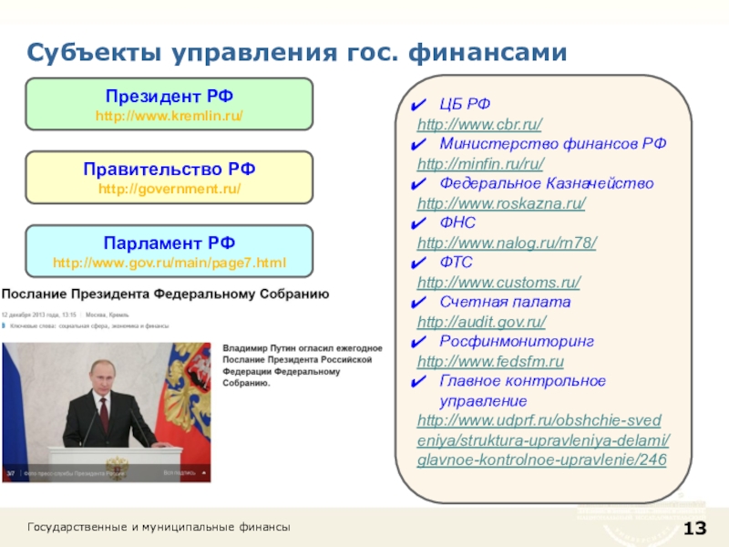 Слайд 13Субъекты управления гос. финансами