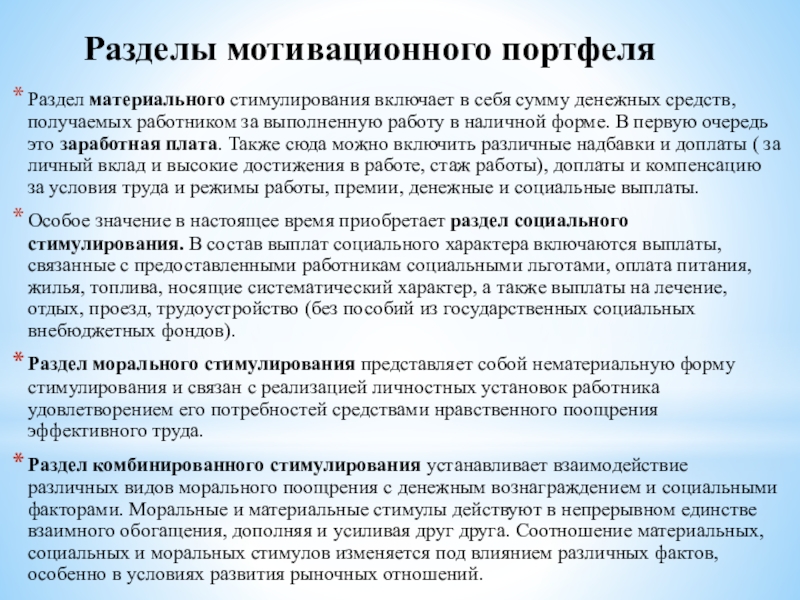 Мотивационный портфель может иметь следующие четыре раздела мотивации и стимулирования: материальный, социальный, моральный, комбинированный.