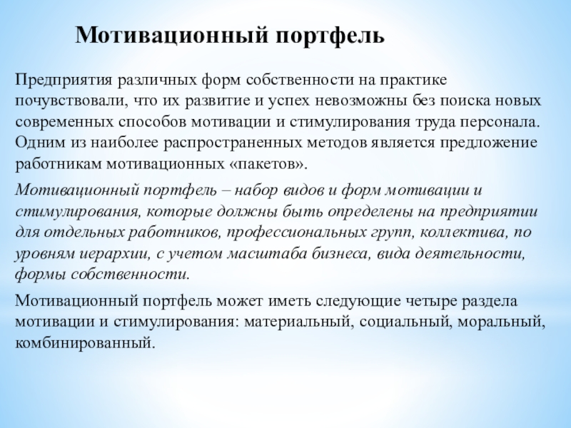Мотивационный портфель – набор видов и форм мотивации и стимулирования, которые должны быть определены на предприятии для отдельных работников, профессиональных групп, коллектива, по уровням иерархии, с учетом масштаба бизнеса, вида деятельности, формы собственности.