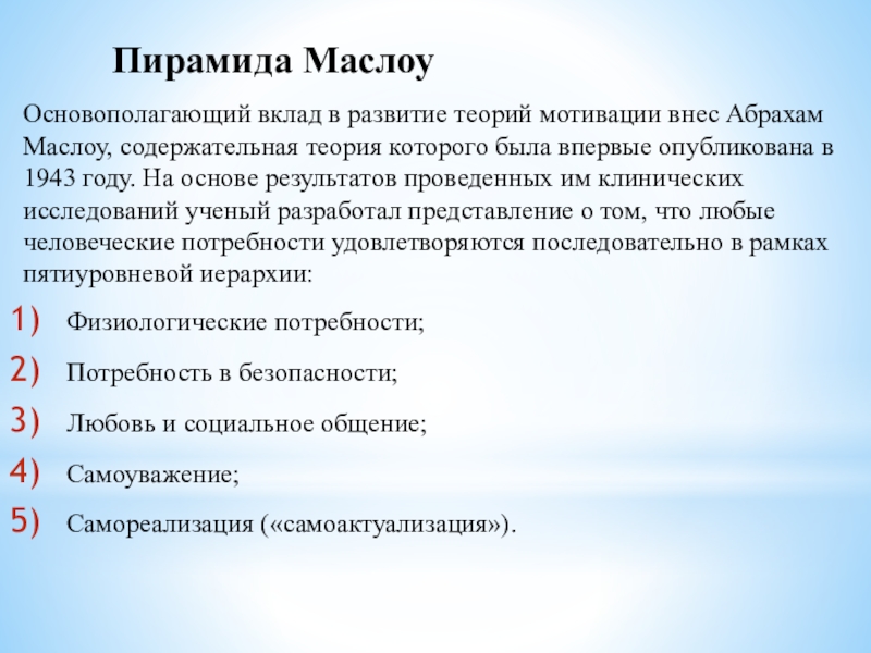 Основополагающий вклад в развитие теорий мотивации внес Абрахам Маслоу,