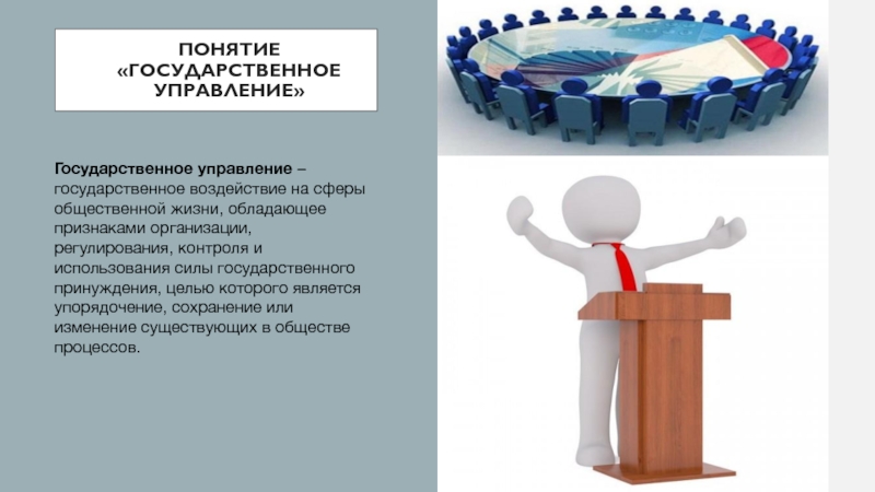 Понятие «государственное управление»Государственное управление – государственное воздействие на сферы общественной жизни, обладающее признаками организации, регулирования, контроля и использования силы государственного принуждения, целью которого является упорядочение, сохранение или изменение существующих в обществе