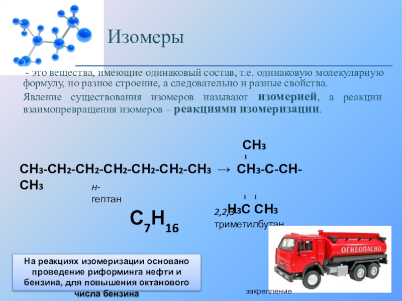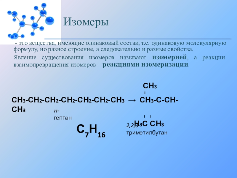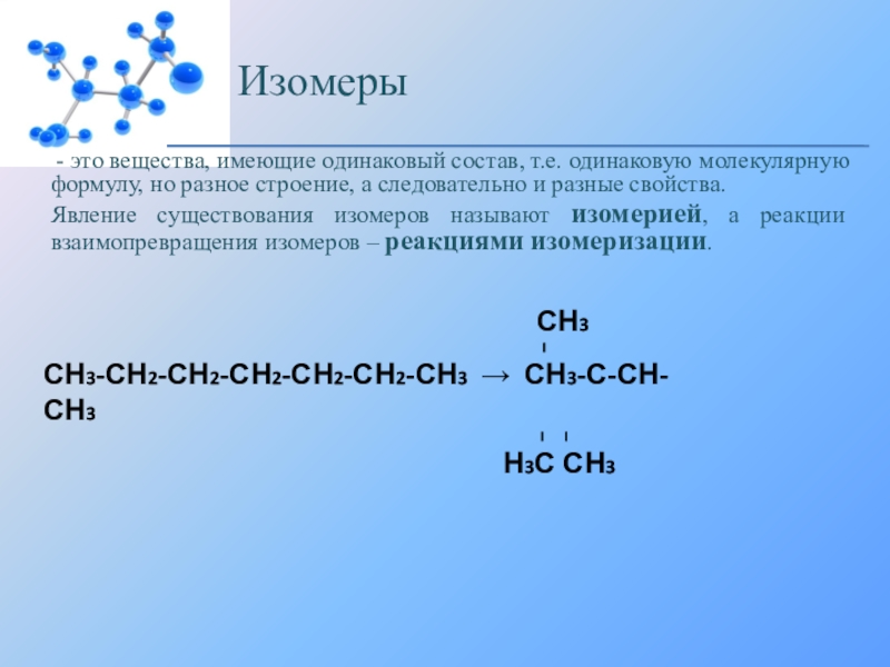 существования изомеров называют изомерией, а реакции взаимопревращения изомеров – реакциями изомеризации.