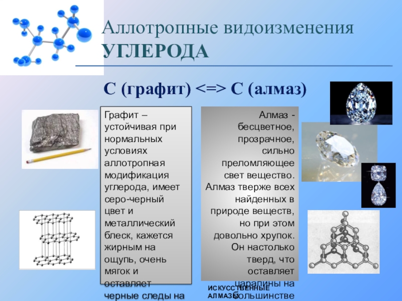 2) различным кристаллическим строением аллотропных модификаций (аллотропные модификации углерода имеют атомную решетку, но у алмаза она объемная тетраэдрическая, а у графита – слоистая).