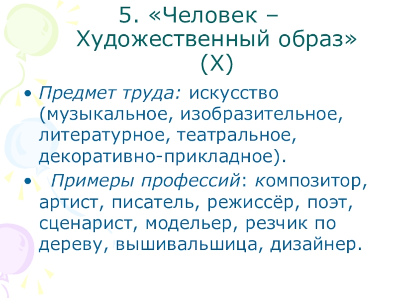 5. «Человек – Художественный образ» (Х)Предмет труда: искусство (музыкальное, изобразительное, литературное, театральное, декоративно-прикладное). Примеры профессий: композитор, артист,