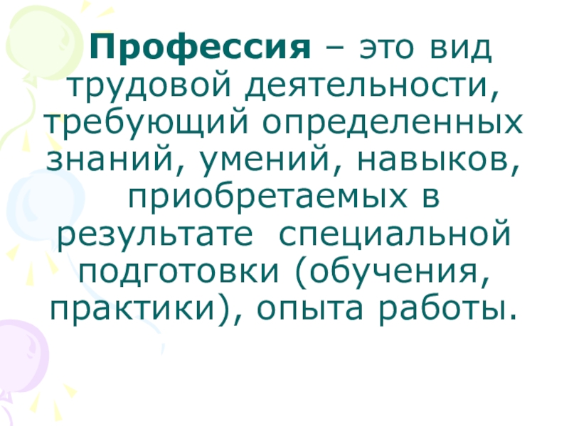 Профессия – это вид трудовой деятельности, требующий определенных знаний, умений, навыков, приобретаемых в результате специальной подготовки