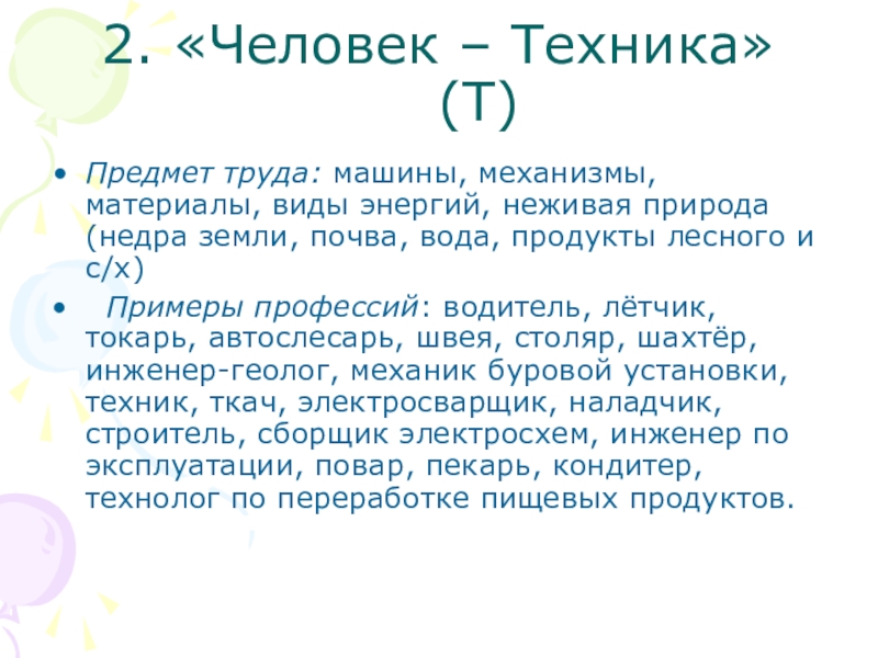 2. «Человек – Техника» (Т)Предмет труда: машины, механизмы, материалы, виды энергий, неживая природа (недра земли, почва, вода,