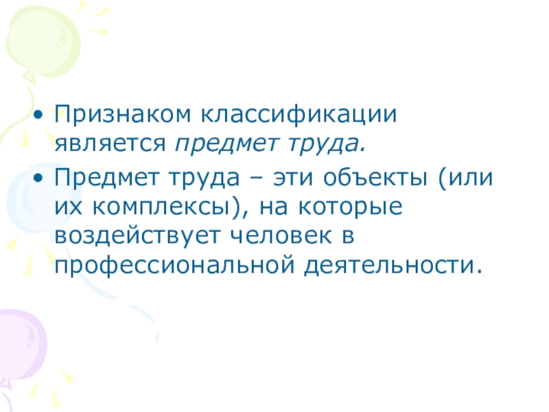 Признаком классификации является предмет труда. Предмет труда – эти объекты (или их комплексы), на которые воздействует человек