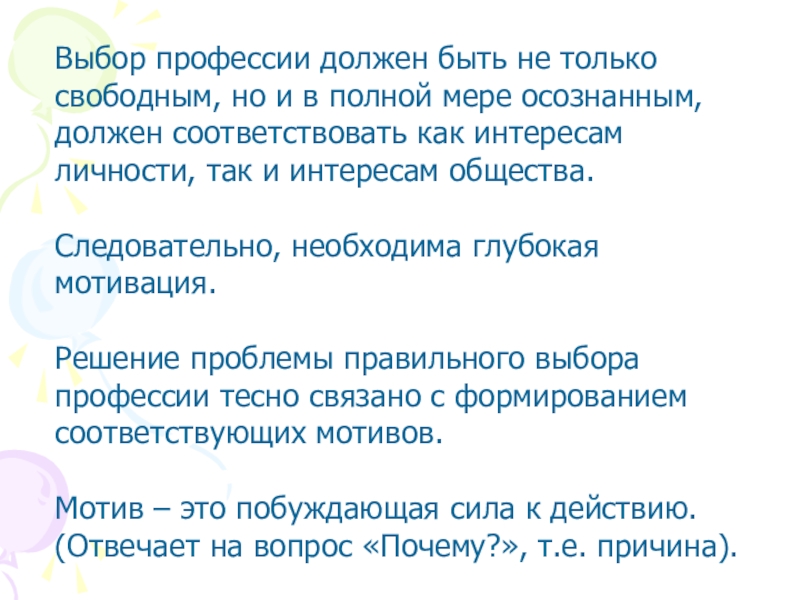 Выбор профессии должен быть не только свободным, но и в полной мере осознанным, должен соответствовать как интересам