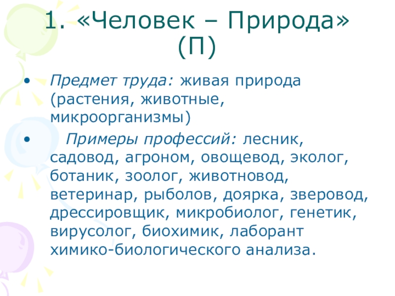 1. «Человек – Природа» (П)Предмет труда: живая природа (растения, животные, микроорганизмы)  Примеры профессий: лесник, садовод, агроном,