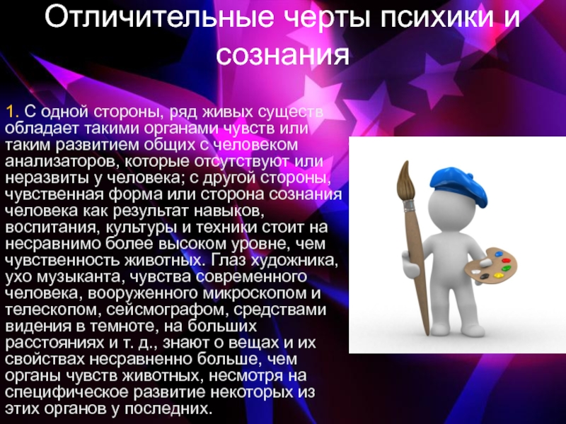 человеком анализаторов, которые отсутствуют или неразвиты у человека; с другой стороны, чувственная форма или сторона сознания человека как результат навыков, воспитания, культуры и техники стоит на несравнимо более высоком уровне, чем чувственность животных. Глаз художника, ухо музыканта, чувства современного человека, вооруженного микроскопом и телескопом, сейсмографом, средствами видения в темноте, на больших расстояниях и т. д., знают о вещах и их свойствах несравненно больше, чем органы чувств животных, несмотря на специфическое развитие некоторых из этих органов у последних.