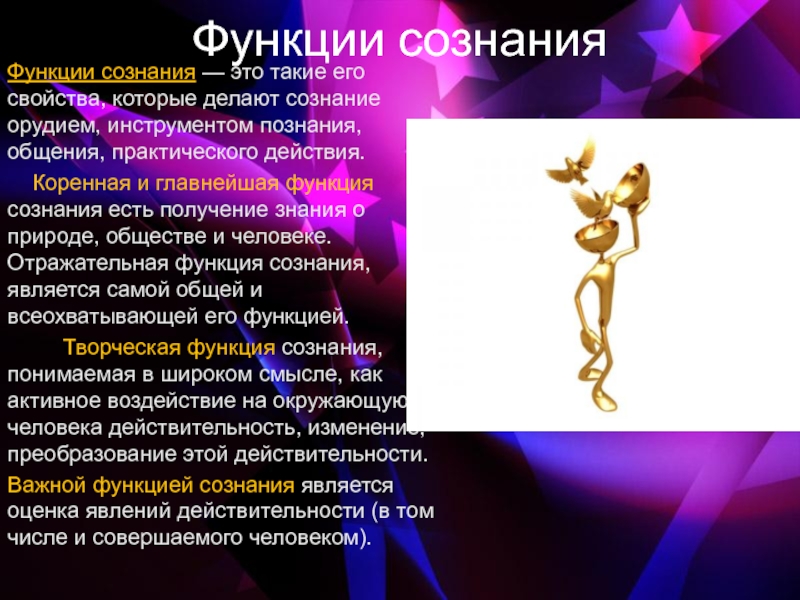 функция сознания есть получение знания о природе, обществе и человеке. Отражательная функция сознания, является самой общей и всеохватывающей его функцией.