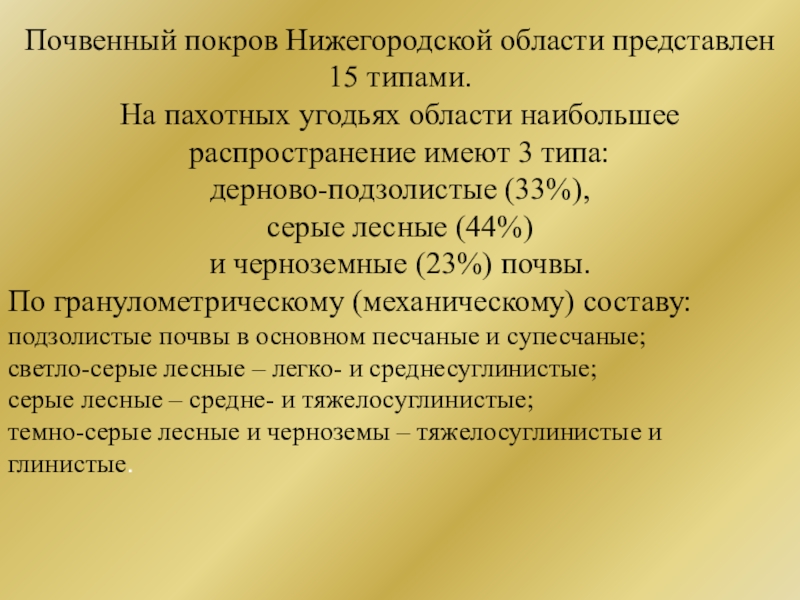 Почвенный покров Нижегородской области представлен 15 типами. На пахотных угодьях области наибольшее распространение имеют 3 типа: дерново-подзолистые
