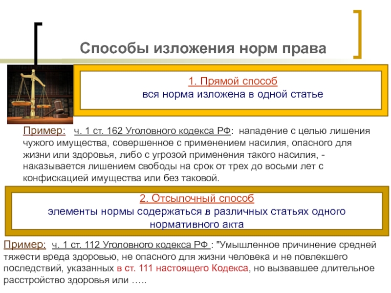 Пример: ч. 1 ст. 162 Уголовного кодекса РФ: нападение с целью лишения