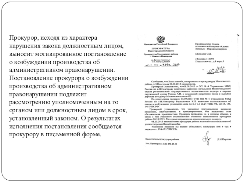 Слайд 10Прокурор, исходя из характера нарушения закона должностным лицом, выносит мотивированное