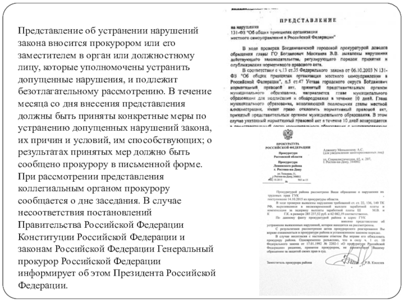 Слайд 8Представление об устранении нарушений закона вносится прокурором или его заместителем
