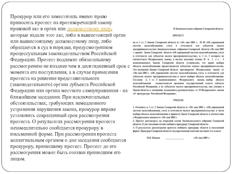 Слайд 6Прокурор или его заместитель имеют право приносить протест на противоречащий