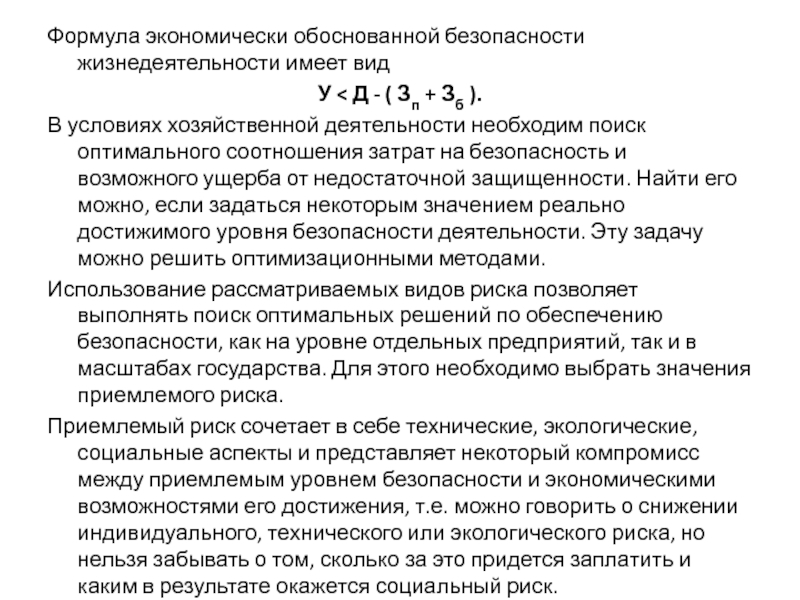 Слайд 15Формула экономически обоснованной безопасности жизнедеятельности имеет вид
