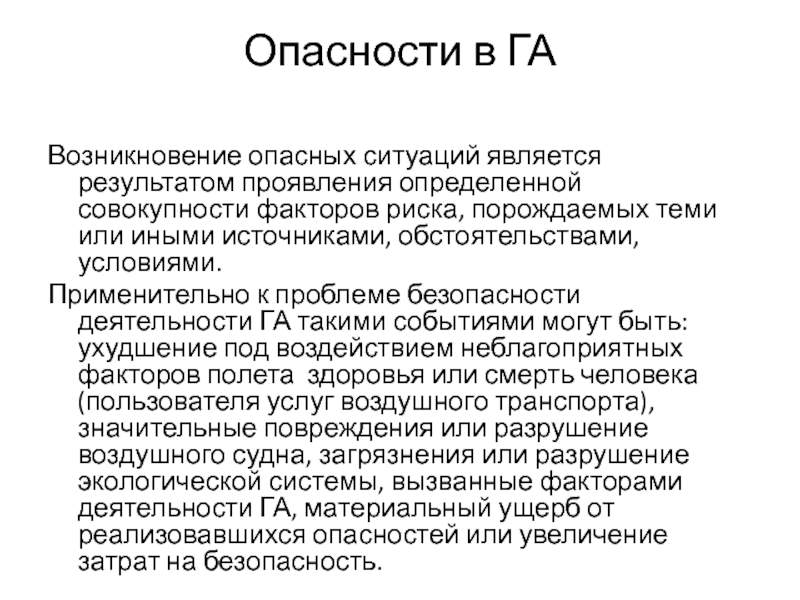 проблеме безопасности деятельности ГА такими событиями могут быть: ухудшение под воздействием неблагоприятных факторов полета здоровья или смерть человека (пользователя услуг воздушного транспорта), значительные повреждения или разрушение воздушного судна, загрязнения или разрушение экологической системы, вызванные факторами деятельности ГА, материальный ущерб от реализовавшихся опасностей или увеличение затрат на безопасность.