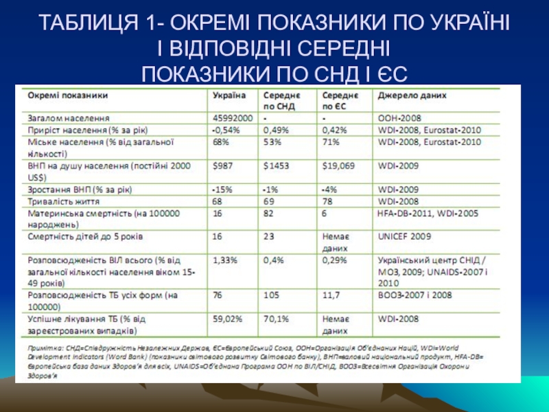 Слайд 32ТАБЛИЦЯ 1- ОКРЕМІ ПОКАЗНИКИ ПО УКРАЇНІ І ВІДПОВІДНІ СЕРЕДНІ